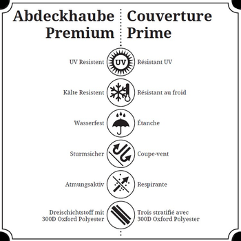 Die wasserdichte und atmungsaktive Abdeckhaube Premium besteht aus drei Schichten.Die äussere Schicht besteht aus robustem, durchgefärbtem 300 Denier Oxford-Polyester, einem äußerst strapazierfähigen und robusten Material, das Ihren Grill vor Witterungseinflüssen und Schmutz schützt. Als Zwischenschicht ist eine atmungsaktive Membran aus thermoplastischem Polyurethan eingearbeitet, die Wasser und Flecken abweist und den Wasserdampf entweichen lässt. Die weiche Innenbeschichtung schützt den Grill vor Kratzern und Schimmel. Eine spezielle Beschichtung macht die Hülle UV-beständig und schützt sie vor dem Ausbleichen.